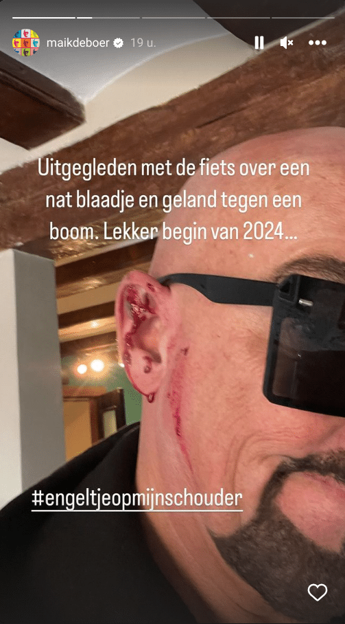 Stylist Maik de Boer is zijn 2024 niet zo lekker begonnen. Met een kater klom hij op de fiets, gleed uit over een blaadje en belandde tegen een boom. Op Instagram toont hij een foto van zijn bloedende oor met de hashtag “engeltje op mijn schouder”.
