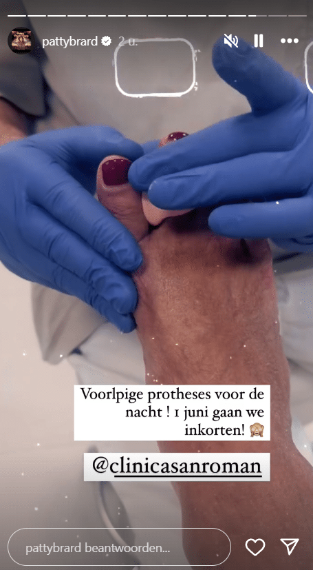 Patty Brard moet haar twee tweede tenen operatief laten inkorten. De reden is dat haar grote tenen anders scheef groeien, schrijft ze op Instagram.