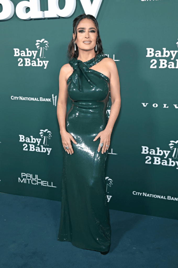 Salma Hayek liet haar vrouwelijke rondingen prachtig uitkomen in een nauwsluitende jurk. De subtiele glinstering maakt het feestelijk en dat komt goed uit, want Salma werd geëerd met de Giving Tree Award voor haar inzet.