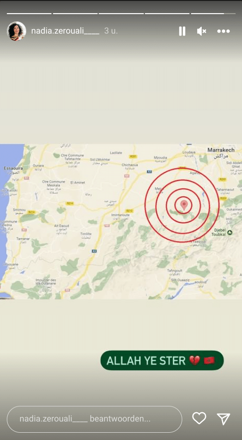 Schrijfster Nadia Zerouali, recent bekroond met het Gouden Kookboek, laat weten dat “gelukkig iedereen veilig is gebleven. Mijn ouders zijn gelukkig veilig in het noorden. Ik wens heel Marokko veel sterkte.”