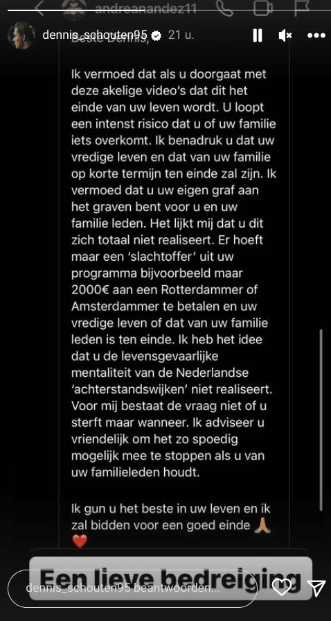 Dennis Schouten deelt doodsbedreiging: ‘Ik benadruk dat uw leven en dat van uw familie op korte termijn ten einde zal zijn’