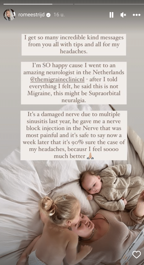 “Ik ben zo blij want ik heb een bezoek gebracht aan een fantastische neuroloog hier in Nederland”, aldus Strijd. “Nadat ik al mijn klachten had verteld zei hij dat het geen migraine is, maar dat het waarschijnlijk komt door Supra-orbitalis neuralgie”, schrijft het model. Dat is een pijnlijke aandoening van de supra-orbitalis zenuw, een aftakking van de voorhoofdzenuw, als gevolg van een beschadiging.