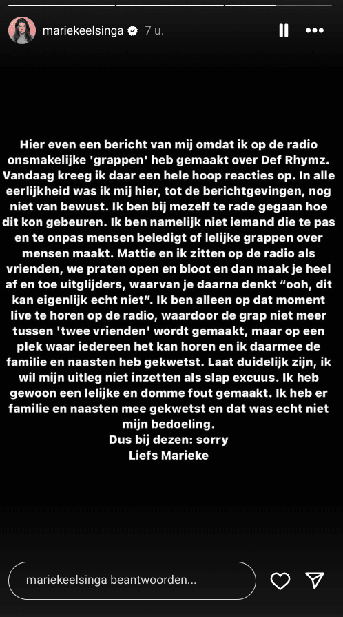 Marieke Elsinga heeft haar excuses aangeboden voor “onsmakelijke grappen” die ze maakte over de zondag overleden rapper Def Rhymz. De radio-dj van Qmusic kreeg op sociale media heel veel kritiek op haar opmerkingen. In haar Instagram Stories schrijft Elsinga dat ze een “lelijke en domme fout” heeft begaan.