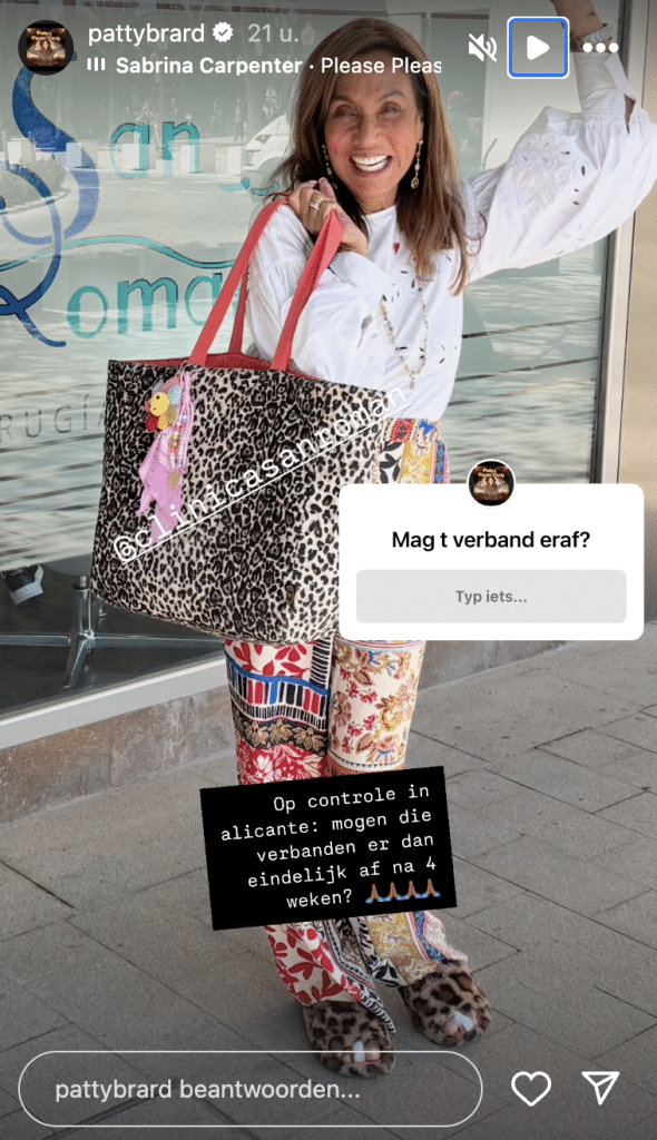 In een kleurrijke outfit en op slippers poseert Patty voor een kliniek in Alicante. ‘Op controle,’ schrijft ze erbij, terwijl haar tenen nog stevig in het verband zitten. ‘Mogen die verbanden er dan eindelijk af na vier weken?’