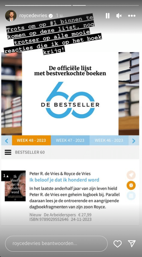 Royce de Vries (34) is er trots op dat zijn boek Ik beloof je dat ik honderd word op de eerste plaats is binnengekomen in de Bestseller 60. Dat schrijft de advocaat, zoon van Peter R. de Vries, woensdagmiddag in zijn Instagram Stories. Boekenkoepel CPNB maakte de nieuwste lijst van bestverkochte boeken eerder woensdagmiddag bekend.
