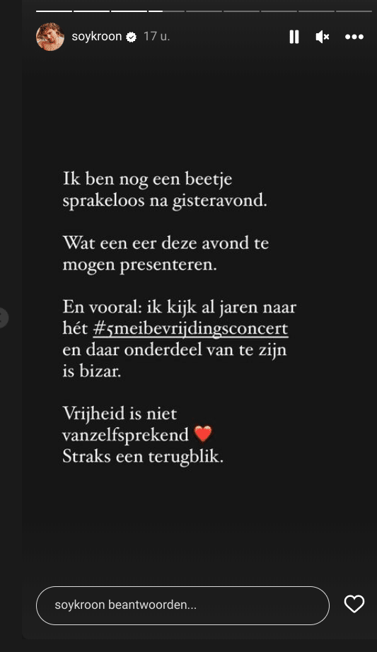 “Ik ben nog een beetje sprakeloos na gisteravond”, schrijft Kroon in zijn Instagram Stories. “Wat een eer deze avond te mogen presenteren. En vooral: ik kijk al jaren naar hét #5meibevrijdingsconcert en daar onderdeel van te zijn is bizar. Vrijheid is niet vanzelfsprekend.”