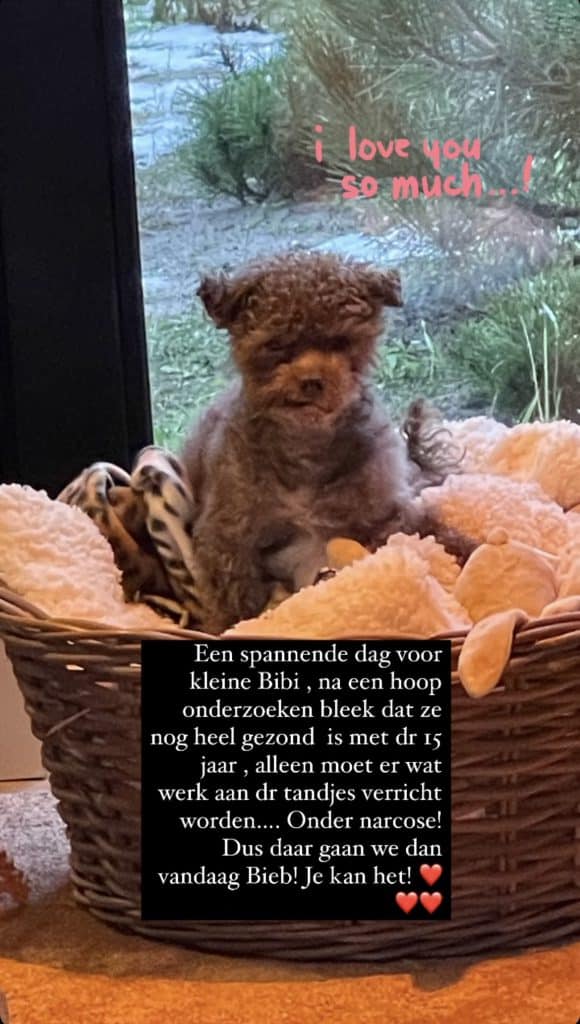 “Een spannende dag voor kleine Bibi”, begint Patty haar bericht. “Na een hoop onderzoeken bleek dat ze nog heel gezond is met haar 15 jaar, alleen moet er wat werk aan haar tandjes verricht worden…” gaat Brard verder.