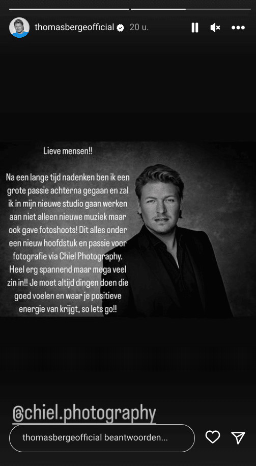 Thomas Berge heeft zich toegespitst op het vak fotografie. Via Instagram maakt de 33-jarige zanger bekend dat hij “na een lange tijd nadenken een grote passie” achterna is gegaan.