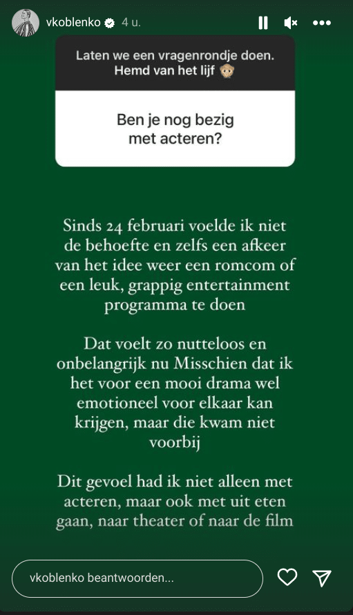 Victoria Koblenko pakt momenteel niet alle acteerklussen aan. De actrice van Oekraïense komaf voelt sinds de oorlog in Oekraïne “niet de behoefte en zelfs een afkeer van het idee weer een romcom of een leuk, grappig entertainmentprogramma te doen.” Dat schrijft Koblenko op Instagram.
