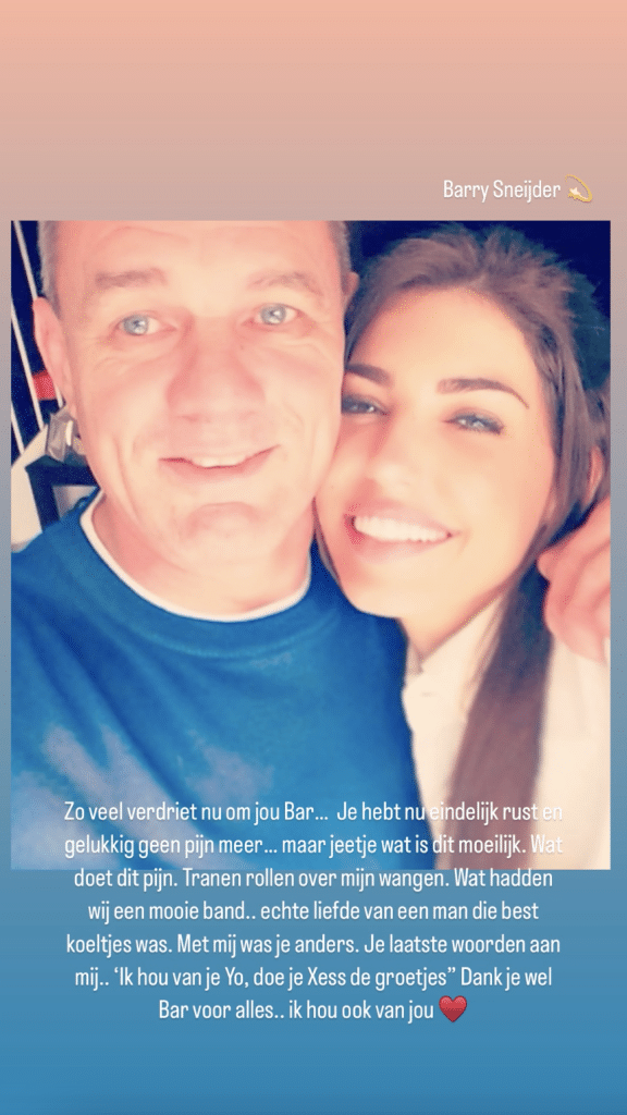 Ook vertelt Yolanthe wat de laatste woorden van Barry aan haar waren. “’Ik houd van je Yo, doe je Xess de groetjes?’ Dankjewel Bar voor alles, ik houd ook van jou.”