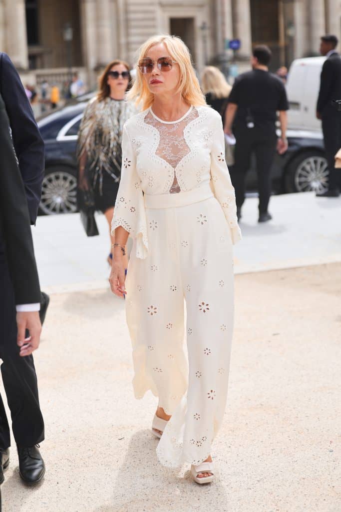 Een combi van comfort én klasse. Het wijdvallende pak van Emmanuelle Béart zit heerlijk, en tegelijkertijd tillen de stof en het kant deze outfit naar een hoger plan.