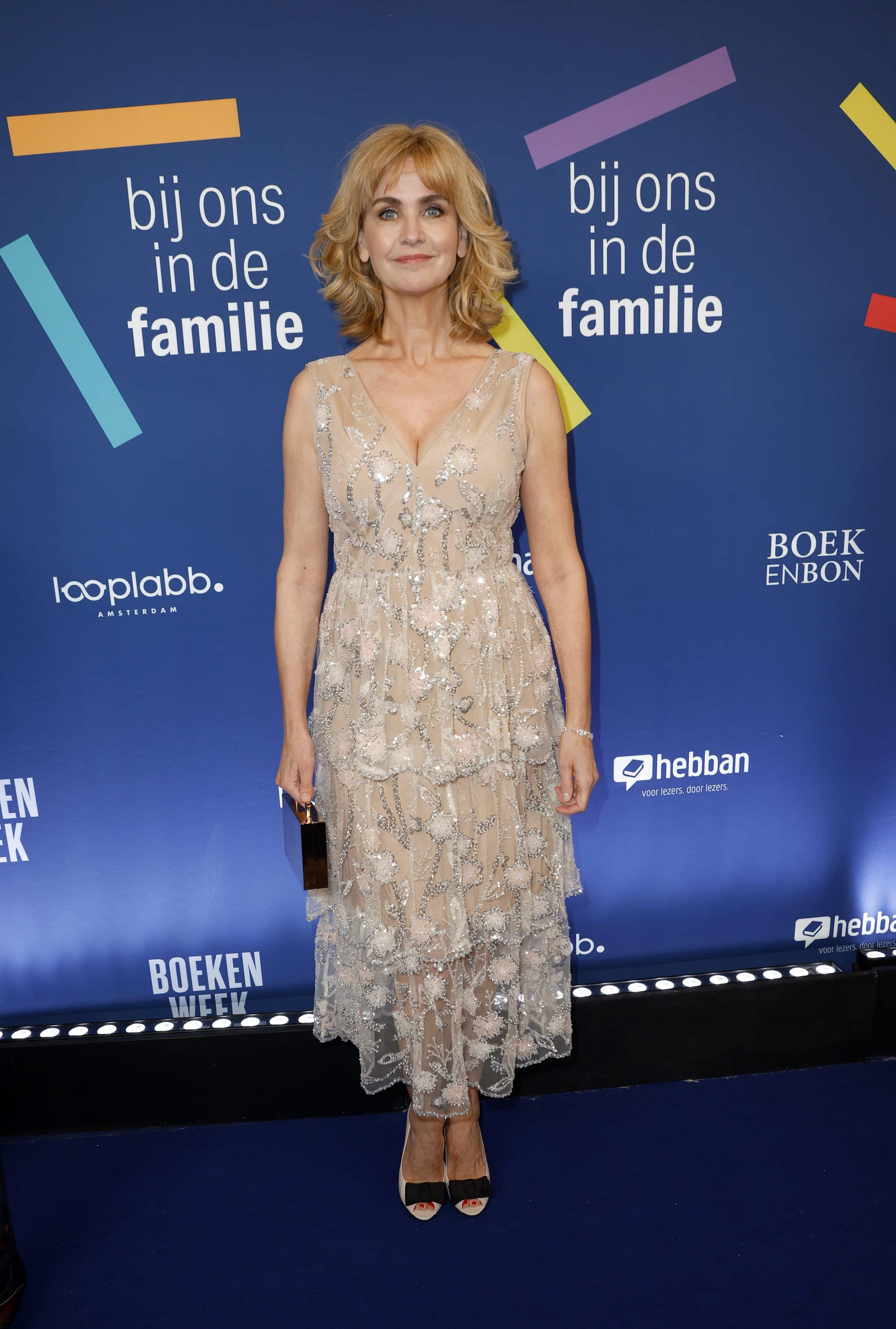 Ze is hartstikke druk met het laatste hoofdstuk van haar nieuwe boek. Toch verruilde Daphne Deckers speciaal voor het Boekenbal haar joggingbroek voor deze doorschijnende jurk met zilveren accenten. Mét gouden koffertje als gewenst detail.
