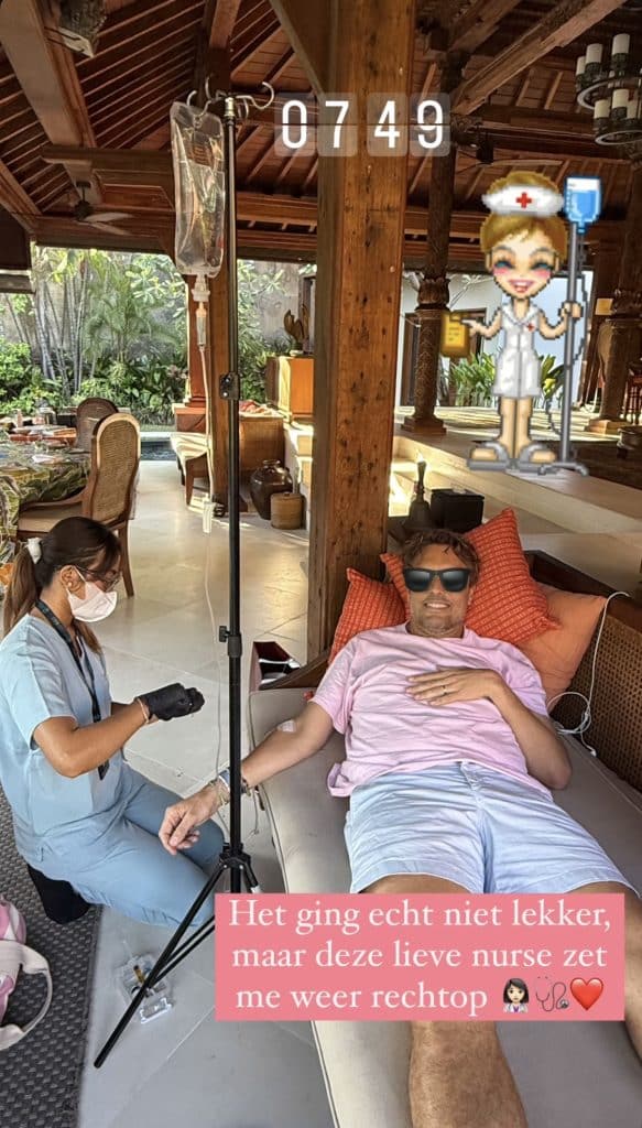 Vervolgens is er een verpleegster langsgekomen met een infuus. “Die prikt je aan een infuus. En dan gaat het beter.” Tijdens de vakantie was Bas niet de enige die ziek werd. Eerder waren Nicolette van Dam en hun dochter Kiki-Kate ook ziek.