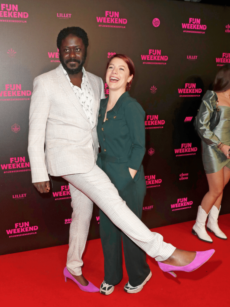 Fijn Weekend gaat over een hechte vriendengroep die in de Franse Bourgogne bij elkaar komt om hun overleden maatje Olivier te herdenken. Bij die ’Ol’ympics gaat het echter meteen al mis als weduwe Evelien aan komt zetten met een nieuwe liefde. Dat mondt uit in een rollercoaster aan emoties, waarbij de verstandhoudingen flink op scherp komen te staan. Sarah was overigens niet de enige zwangere tijdens de première in Tuschinski. Ook actrice Laurien Verstraten is in verwachting van haar tweede kindje en poseert vol trots zwanger naast haar partner Olivier.