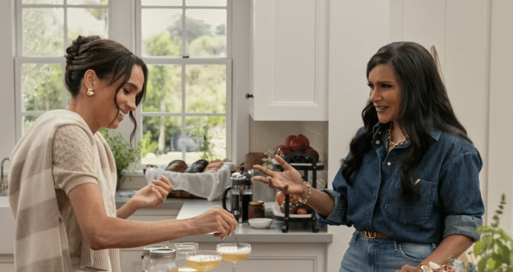 In de tweede aflevering maakt actrice Mindy Kaling een grapje dat de wereld waarschijnlijk geschokt zou zijn om te weten dat Meghan fan is van Jack in the Box [fastfoodketen. red]. Meghan reageert lachend: “Het is zo grappig dat je ‘Meghan Markle’ blijft zeggen. Je weet toch dat ik nu Sussex ben?”