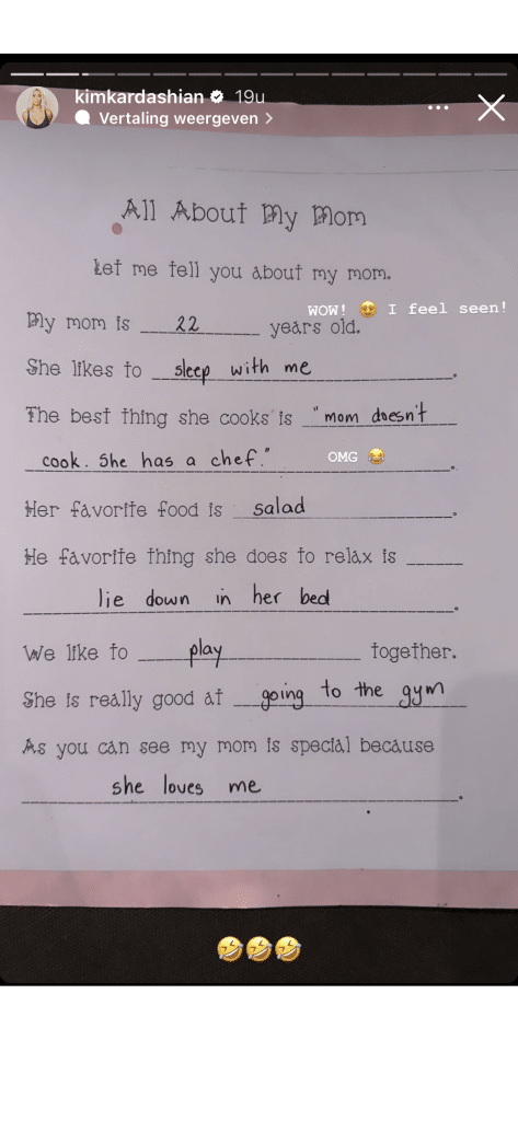 Ook onthult de kleine dat moeder “nooit kookt”, tot hilariteit van Kardashian zelf. “Ze heeft een chef”, staat erachter, waarop Kardashian met een lachende emoji reageert. “Haar favoriete eten is een salade”, “ze relaxt door in haar bed te liggen” en “ze is heel goed in naar de sportschool gaan”, zijn andere kenmerken van de realityster.